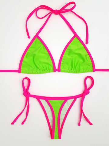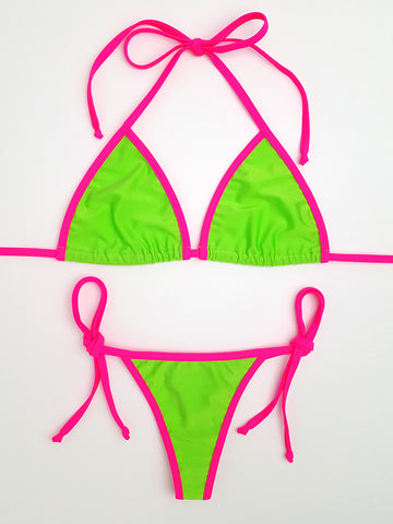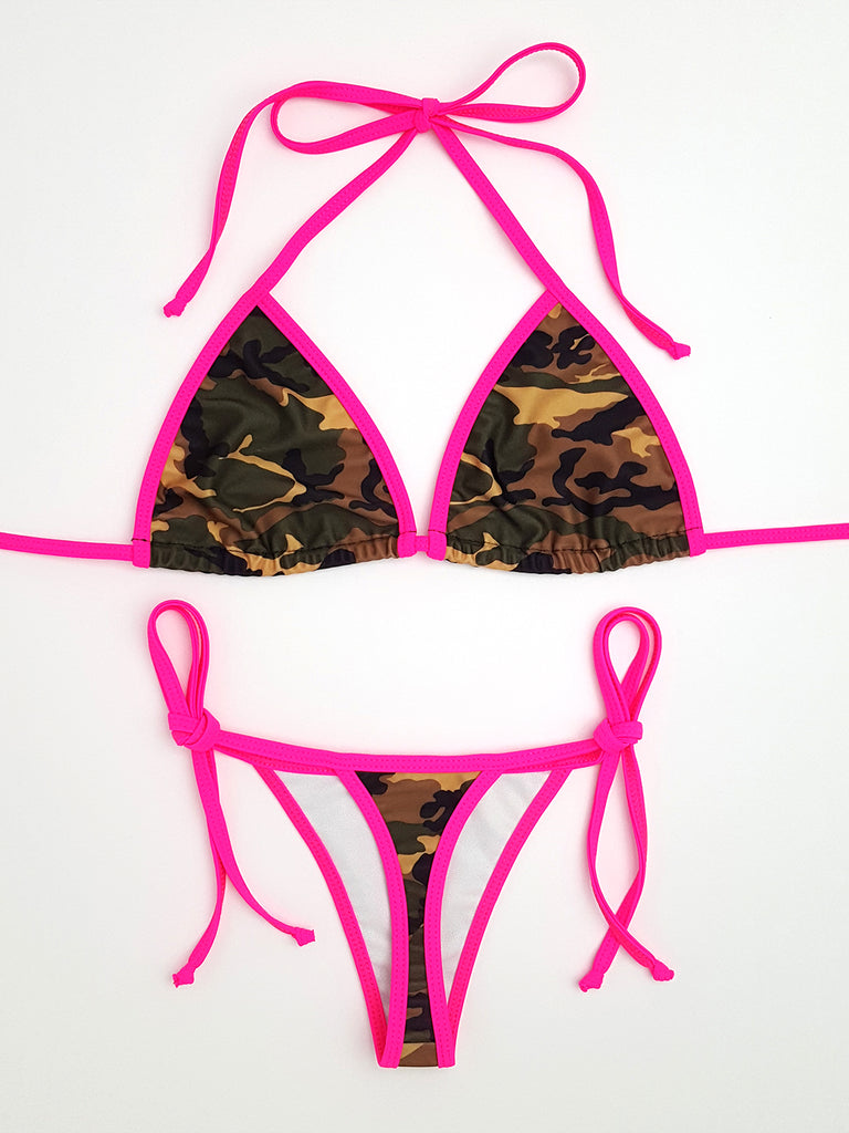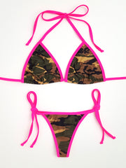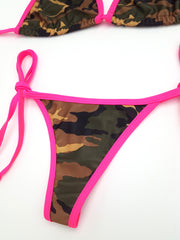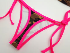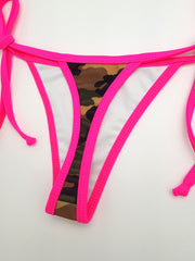 The tiny Thong bottom is our ultimate minimal coverage bikini. If you've got it flaunt it with a low rise and extra skimpy bottom. You will never blend in with this camouflage print with neon pink trim and tie strings bikini. Our camo print is hugely popular with customers and no wonder because it looks fantastic on everyone and everywhere you decide to wear it. Pick your top and bottom sizes separately.